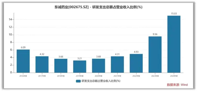 其次,核药业务投入期长,盈利承压。核药房网络的建设是个重资产、长周期的苦活。单个核药房建设周期需3年以上,投资数千万,且需提前卡位。这意味着东诚药业仍在投入期,折旧和运营成本高企。更关键的是,虽然公司手握多款治疗类核药在研管线,但商业化仍需时间。体现在财报上,公司的研发费用率在持续攀升。