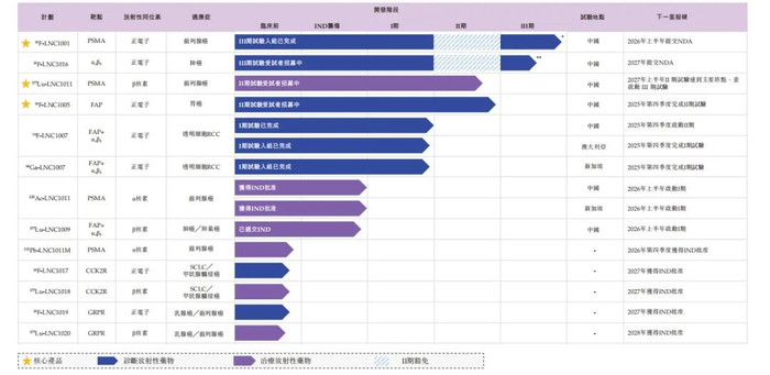 蓝纳成生物已构建起由13款候选药物组成的多元化产品管线,涵盖7款诊断放射性药物及6款治疗放射性药物,管线布局全面且聚焦核心需求。