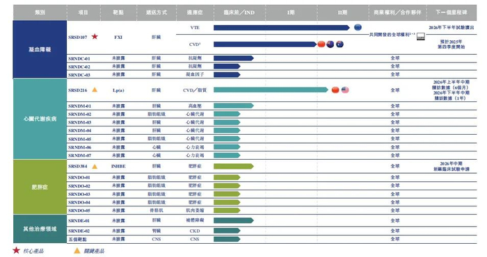 核心产品SRSD107是一款潜在FIC靶向凝血因子XI(FXI)的siRNA药物,主要用于治疗血栓栓塞性疾病,其亮点在于可在降低血栓风险的同时减少出血风险,目前正于欧洲开展II期多中心临床试验,并计划在中国及澳大利亚/新西兰启动另一项II期试验,进一步拓展临床数据支撑;
