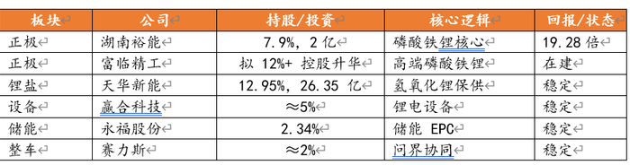 2.中游:围绕动力电池及储能产业链,投资正极材料、负极材料、锂电设备等制造商,通过资本纽带实现产业协同与联合研发,构建良性产业生态。