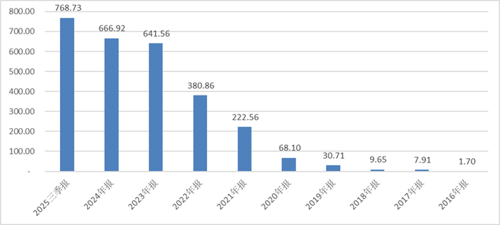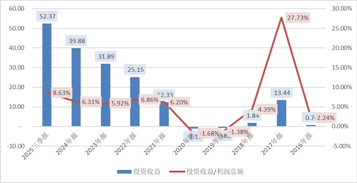 截至2025年三季度末,上述两项合计金额为768.73亿元,占总资产的比例为8.58%。从2016年的1.7亿元增长至最新的768.73亿元,投资收益对利润的影响也逐步扩大。2025年前三季度,公司实现投资收益52.37亿元,约占利润总额的8.63%。