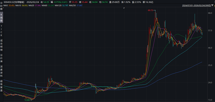 从股价走势看,先导智能股价自2024年下半年起随业绩预期好转逐步回升,2025年盈利高增推动股价进一步走高。截至2026年2月24日,股价为54.43元。