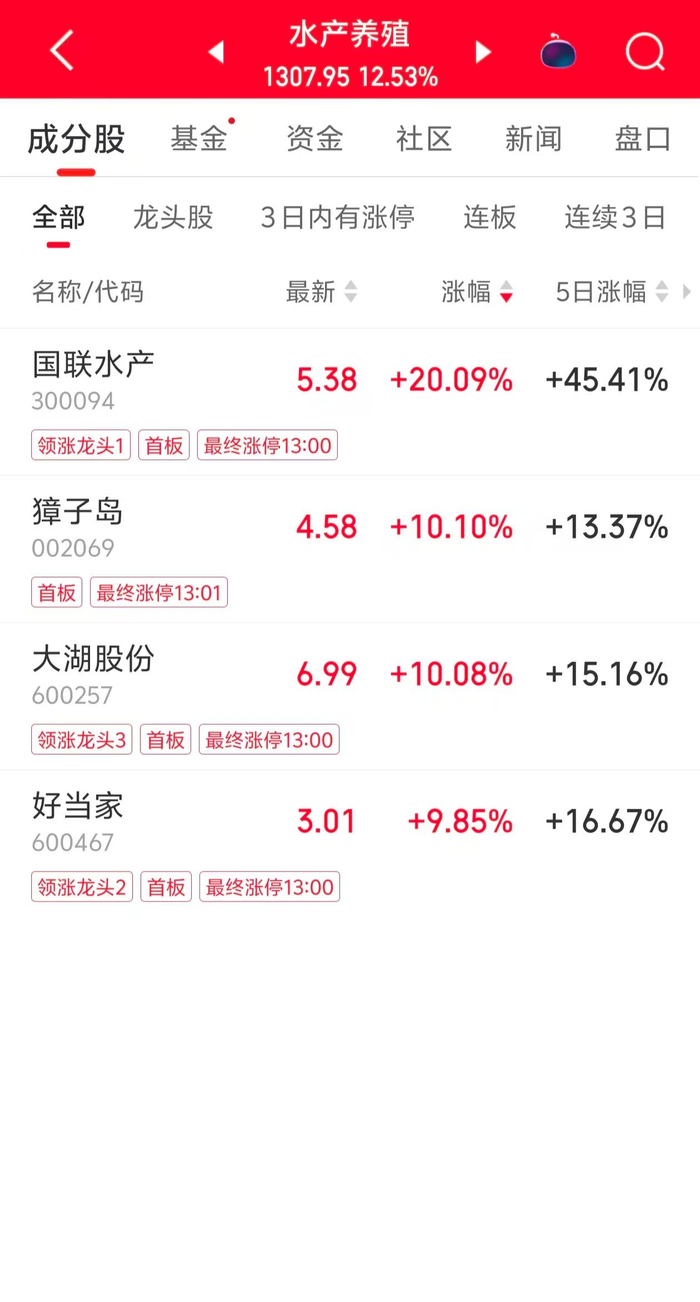 11月19日,水产股午后继续走强,养殖概念股国联水产(300094.SZ)、好当家(600467.SH)、大湖股份(600257.SH)、獐子岛(002069.SZ)午后开盘秒板,中水渔业(000798.SZ)、开创国际(600097.SH)、东方海洋(002086.SZ)等早盘时已涨停。