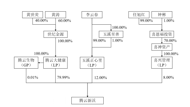 穿透到最终受益人看,腾云新沃由多方持股。除了实际控制人黄涛及自然人黄世荧外,还有沃森生物目前的第三大股东、公司创始人之一的李云春,以及曾担任沃森生物原独立董事的钟彬及配偶任旭红。