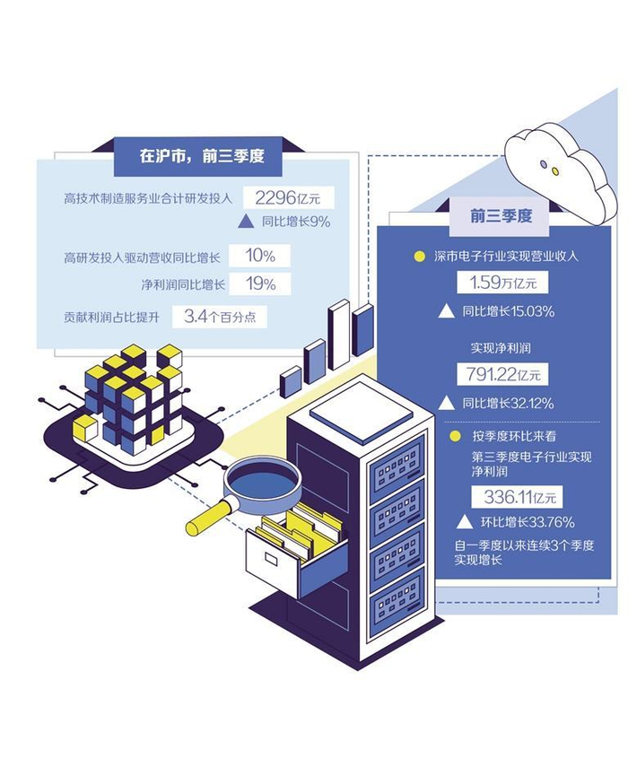 新质生产力正成为推动业绩增长的关键动力。三季报显示,高技术行业保持较快增长。在沪市,前三季度,高技术制造服务业合计研发投入2296亿元,同比增长9%。高研发投入驱动营收、净利润同比分别增长10%、19%,贡献利润占比提升3.4个百分点。其中,AI驱动半导体产业浪潮,芯片设计、半导体设备前三季度净利润同比分别增长82%、25%,多家公司业绩增长显著。