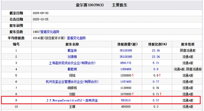 截至2025年9月30日,豪尔赛主要股东中,J.P.MorganSecuritiesPLC-自有资金持股0.37%,为第9大股东。这是J.P.摩根首次出现在豪尔赛前十大股东名单中。