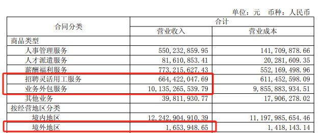 外服控股同样依赖业务外包,该板块实现收入101.35亿元,同比增长42.4%,占总营收比重达82.8%。而薪酬福利服务收入7.73亿元,同比下降10.9%;招聘及灵活用工服务收入6.64亿元,同比增长23.6%,占比5.4%。