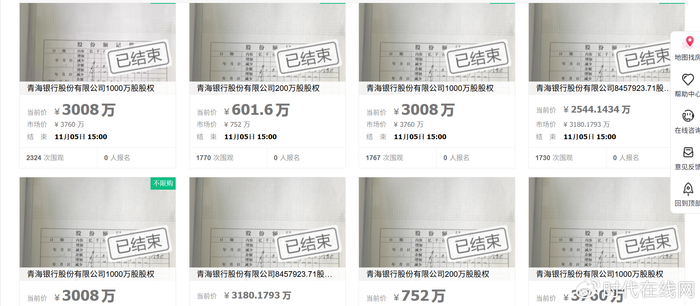时代周报记者注意到,近年,青海银行股权多次遭流拍。最近一次是在11月5日,青海银行共约4045.79万股股权在阿里拍卖网开拍,起拍价合计约1.22亿元,并最终以流拍告终。