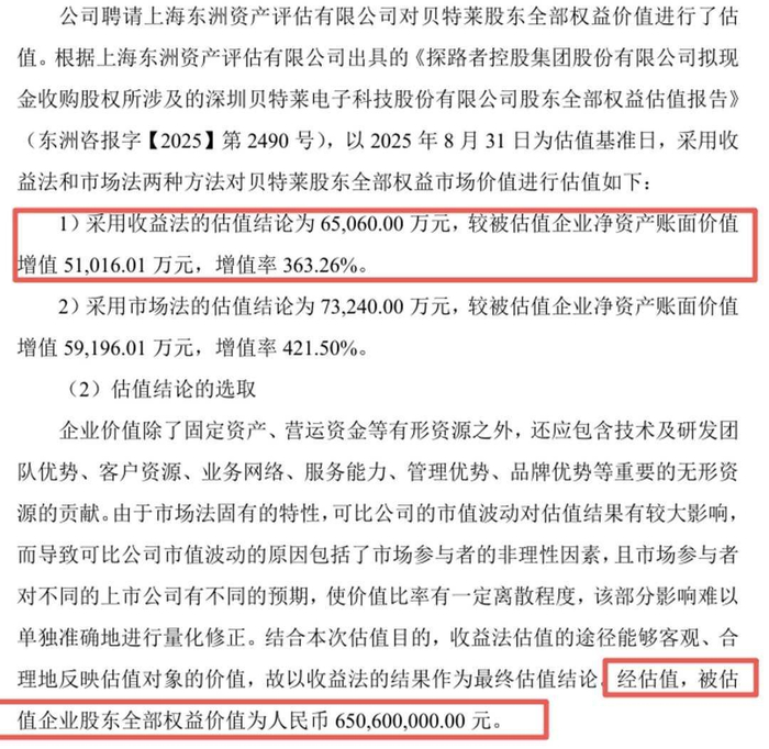 本次收购的核心关注点在于其交易对价。贝特莱以指纹识别、触控等数模混合芯片的研发销售为主业,评估报告采用收益法得出其股东全部权益价值约为6.506亿元,相较于账面净资产,实现363.26%的增值率。