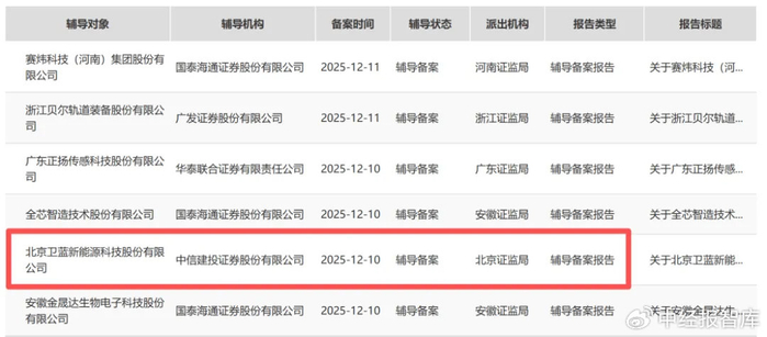 日前,中国证券监督管理委员会网上办事服务平台显示,北京卫蓝新能源科技股份有限公司(以下简称“卫蓝新能源”)向北京证监局提交创业板IPO辅导备案,拟登陆创业板,辅导券商为中信建投(601066.SH)。