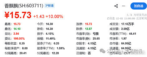 2025年12月3日,A股“奶茶第一股”香飘飘食品股份有限公司(以下简称“香飘飘”)突然迎来股价异动,盘中触及涨停价15.73元,单日涨幅10%,总市值攀升至64.95亿元,成交额达2.59亿元。