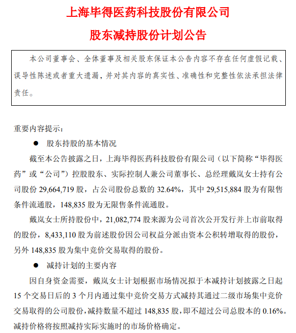 11月25日,毕得医药(688073.SH)发布公告,因自身资金需要,公司控股股东、实际控制人兼公司董事长、总经理戴岚计划根据市场情况拟于减持计划披露之日起15个交易日后的3个月内通过集中竞价交易方式减持其通过二级市场集中竞价交易取得的公司股份,减持数量不超过14.88万股,即不超过公司总股本的0.16%。减持价格将按照减持实际实施时的市场价格确定。
