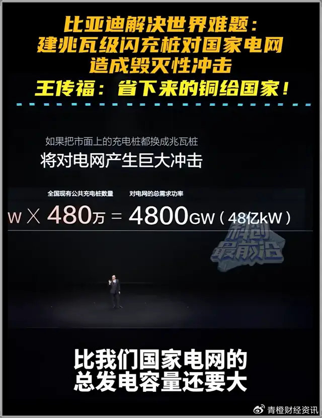 正常情况下,确实无法运作。比亚迪董事长王传福现场直接算了一笔账:如果将全国现有的480万个公共充电桩全部升级为兆瓦级,理论上将产生4800GW的功率需求,而目前全国总发电装机容量仅约3800GW。