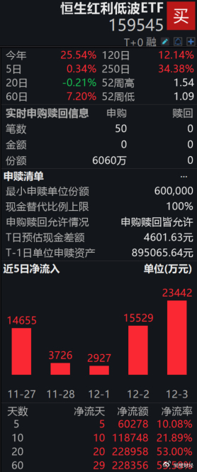 恒生红利低波ETF(159545)紧密跟踪恒生港股通高股息低波动指数,该基金备受资金关注,近5日资金净流入超6亿,近10日资金净流入超11亿;截至发稿,该基金盘中资金净申购6060万份。