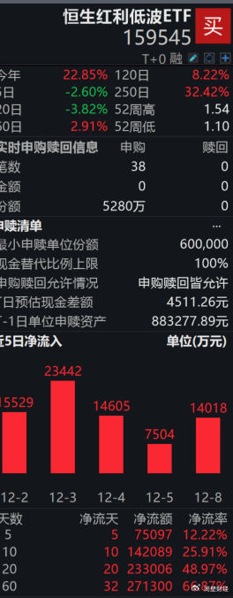 恒生红利低波ETF(159545)紧密跟踪恒生港股通高股息低波动指数,该基金备受资金关注,近5日资金净流入超7.5亿,近20日资金净流入超23亿;截至发稿,该基金盘中资金净申购5280万份。
