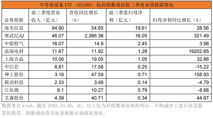 业绩方面,近期半导体设备ETF(561980)标的指数中多家成份股披露三季报业绩公告。
