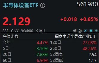 3月18日早盘,半导体设备板块再度异动。截至上午9时32分,半导体设备ETF(561980)放量上涨1.09%,权重股集体飙涨——长川科技涨超2%,海光信息涨1.12%,北方华创、中微公司双双涨约1%。