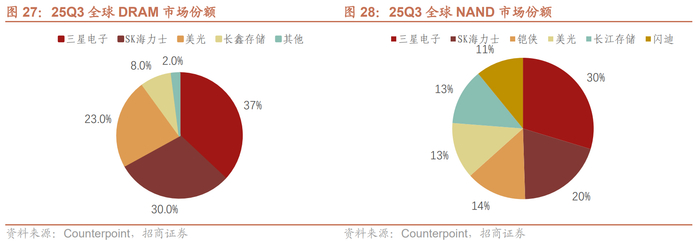 目前国外主要由三星、SK海力士、美光三大存储原厂占据全球主要份额,国内DRAM第一供应商长鑫存储2025年三季度占全球份额的8%,另一家国产NAND龙头长江存储2025年三季度占全球销量份额的13%,目标2026年占全球份额的15%,扩产后供应量预计占全球20%。