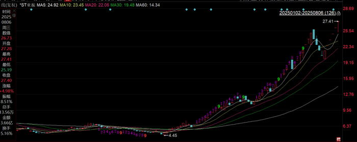 资本市场的反应堪称狂热。自4月8日触及4.45元年内低点以来,*ST亚振股价在四个月内飙涨516%,最高触及27.41元,市值从12亿元低谷快速膨胀至近80亿元。短短几个月吴涛的账面浮盈已高达382.39%。