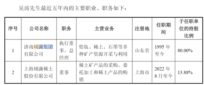 吴涛目前执掌多家企业集团,身兼济南域潇集团有限公司及济南域潇资源控股有限公司董事长,同时担任上海域潇稀土股份有限公司董事职务,上述企业注册资本均为2亿元。公开资料显示,由其掌舵的域潇集团创立于1995年,涉及锆钛、石墨、稀土等矿产资源开发以及海运物流等多个领域。据最新财务数据显示,截至2024年末,该集团总资产规模突破百亿大关,年产值同样达到百亿元量级。