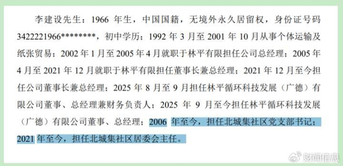 据公开资料显示,李建设1966 年生,初中学历,早年从事个体运输及纸张贸易,同时还担任北城集社区党支部书记和居委会主任。这种“企业家+社区主任”的双重角色,可能带来公司治理方面的隐患。社区公务与企业经营之间的利益冲突如何规避,公司决策是否能够充分考虑各方利益成为市场关注焦点。