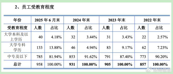 尤为引人注目的是,公司研发人员数量虽达到104人,占比11.17%,但其中至少有26名研发人员学历为专科甚至中专。这意味着,公司研发团队中低学历人员占比较高,其研发能力和创新能力令人担忧。