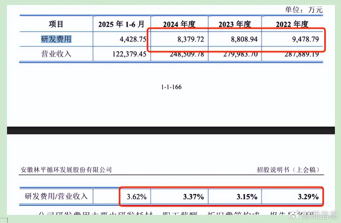 除了员工学历结构失衡外,林平发展的研发投入持续缩减。据招股书披露,2024年公司研发费用为8379.72万元,占营业收入的3.37%,低于同期行业平均的3.44%。与行业龙头晨鸣纸业等企业相比,林平发展的研发投入更是相形见绌。晨鸣纸业2024年的研发投入高达10.80亿元,是林平发展的十余倍。
