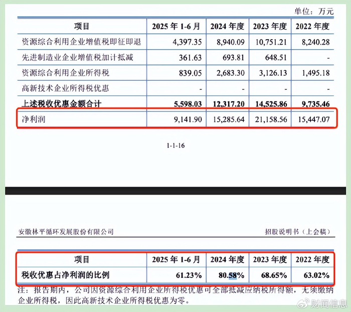 据招股书显示,林平发展在2022年至2024年度享受的税收优惠金额占净利润的比例持续攀升,从2022年的63.02%一路飙升至2024年的80.58%。而在2022年至2024年期间,林平发展累计所享受到的税收优惠金额累计达到了3.65亿元,要知道这三年公司累计净利润总额也仅仅只有5.19亿元。更为市场担忧的是,该报告期内还呈现逐年增长态势,其中仅在2024年度如果没有税收优惠的支撑,公司净利润将骤降至仅3000万元左右,盈利能力大打折扣。