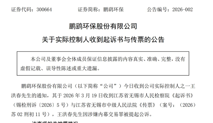 3月20日晚间,创业板上市公司鹏鹞环保(300664.SZ)发布公告,披露公司实际控制人之一王洪春于3月19日收到江苏省无锡市人民检察院《起诉书》与无锡市中级人民法院《传票》,其因涉嫌内幕交易罪被正式提起公诉。