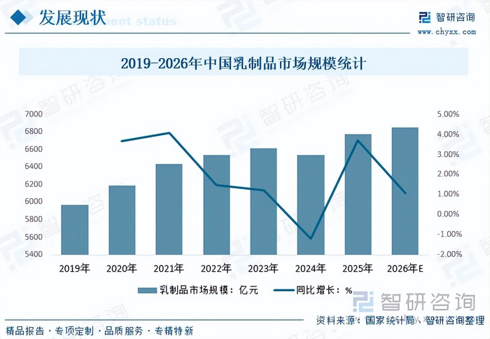 乳制品因其丰富的营养价值和广受欢迎的口味,已成为人类生命周期中主要的膳食主食之一。与发达国家市场相比,中国乳制品行业起步相对较晚。但随着我国经济的稳健发展和人们生活水平的日益提高,乳及乳制品越来越受到消费者的青睐,是人们追求营养、健康饮食的一大载体,乳制品行业得以快速发展且日渐成熟,中国乳制品市场保持稳定增长。2025年,中国乳制品市场规模从2019年的5970亿元增长至6778亿元,预计2026年中国乳制品市场规模将达到6851亿元。