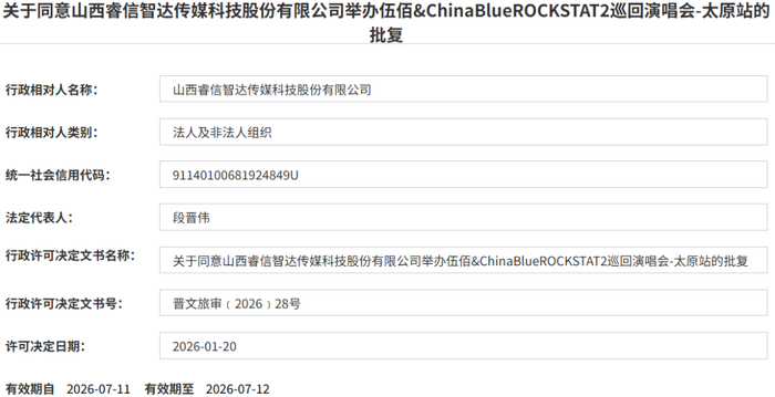 近日,山西省文化和旅游厅公示同意将分别在太原、大同举办伍佰&ChinaBlueROCKSTAT2巡回演唱会、任贤齐《齐迹2026》巡回演唱会,这两场演唱会分别由两家公司举办。