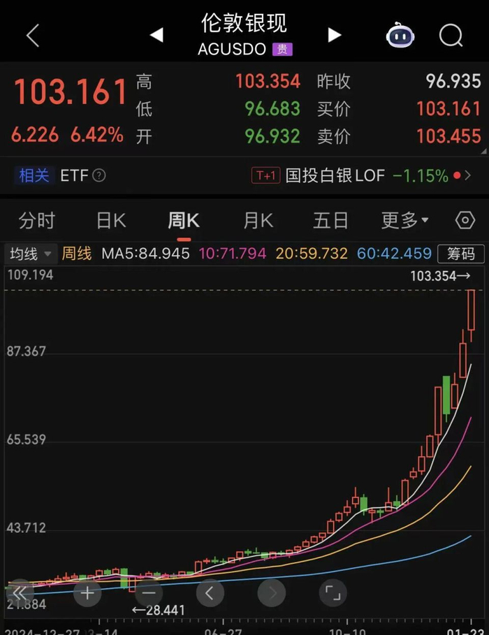 现货白银日内涨幅高达近7.0%,报103.16美元/盎司,史上首次站上100美元关口,本周累计上涨14.6%,2025年涨幅更是达147%。
