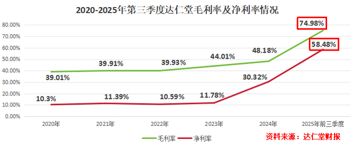 2025年前三季度,达仁堂综合毛利率从2024年的48.18%提升到74.98%,净利率也从30.32%提升至58.48%。