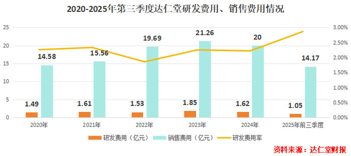 2020-2025年第三季度,公司历年销售费用基本在15亿元以上,远超研发费用。不过,我们同样能看到,目前其研发费用率已经有所上升,这也算开了个好头。