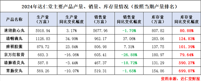 2024年,除了清咽滴丸和痹祺胶囊以外,公司产销量前六名产品的销售量均同比下滑,部分产品下滑幅度甚至达到26.88%;不仅如此,这些产品的库存量更是激增,大部分产品的库存量同比增幅甚至超过了100%。