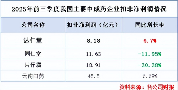 2025年前三季度,在我国主要中成药企业中,达仁堂扣非净利润为8.18亿元,同比增长6.7%。