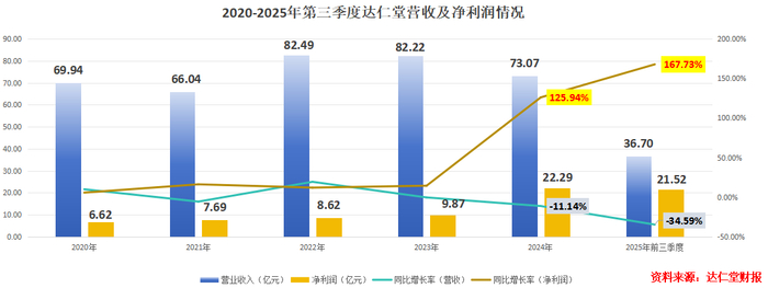 2025年10月31日,达仁堂发布三季报。前三季度,公司营收36.7亿元,同比下滑34.59%;净利润却高达21.52,逼近2024年全年净利润水平,同比大增167.73%。