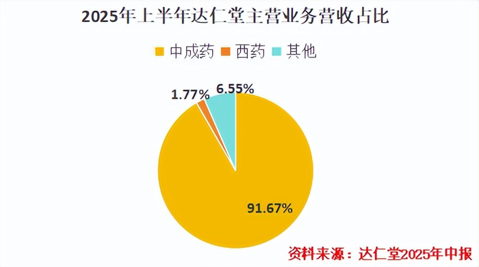 目前,公司九成以上的主营业务营收都是被中成药撑起来的。据最新数据,2025年上半年,达仁堂中成药营收占比高达91.67%,西药的份额只有1.77%,这种业务聚焦程度在全行业内也属于较高水平。