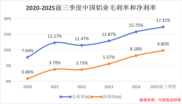 2022到2025年前三季度,中国铝业毛利率从11.47%提升到17.31%,净利率也不断提升。