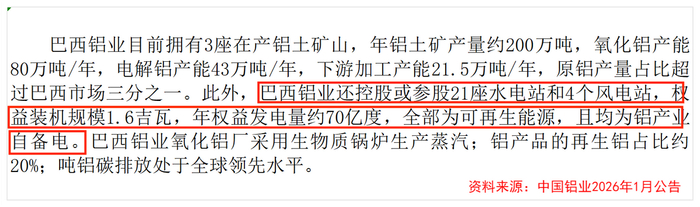 巴西铝业控股或参股了21座水电站和4个风电站,权益装机规模达1.6吉瓦,年发电量约70亿度,可满足自身生产用电需求。