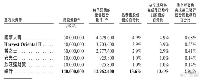国民技术基石投资者分别为国华人寿、Harvest Oriental II、戴婉琴女士、安江波、欣旺达财资,一共认购1.4亿港元。