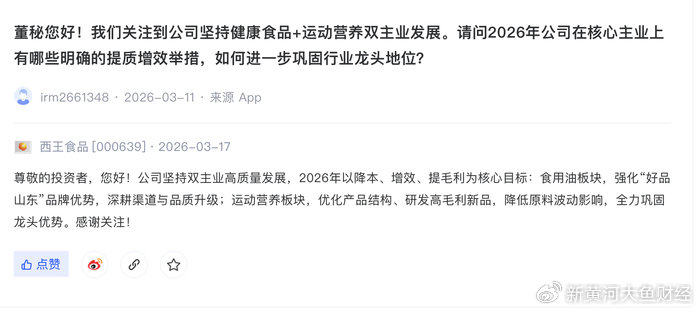 3月17日,西王食品在互动平台回答投资者提问时表示,公司坚持双主业高质量发展,2026年以降本、增效、提毛利为核心目标:食用油板块,强化“好品山东”品牌优势,深耕渠道与品质升级;运动营养板块,优化产品结构、研发高毛利新品,降低原料波动影响,全力巩固龙头优势。