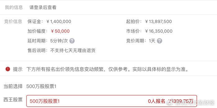 为便于股权处置,上述股份被拆分为34个500万股的拍卖标的,与9个数额不等的标的分拆上架。其中每个500万股股票标的公示信息显示,标的保证金为140万元,起拍价1389.75万元,加价幅度为5万元。拍卖方特别提示,本次标的起拍价以2026年3月30日前60个交易日股票收盘价的平均价乘以85%确定,平台公示价格仅为展示价,实际起拍价将在开拍前完成最终的调整。