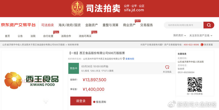 根据西王食品发布的公告及京东拍卖平台公示的信息可以了解到,此次司法拍卖由山东省济南市中级人民法院执行,拍卖时间为2026年3月30日10时至3月31日10时(延时除外),拍卖标的为西王集团持有的西王食品200065333股股票,占西王集团所持公司股份总数的99.01%。