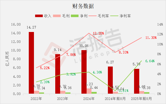 收入分别约为人民币14.27亿、9.14亿、10.06亿、6.27亿、5.79亿,2025年前8月同比-7.66%;
