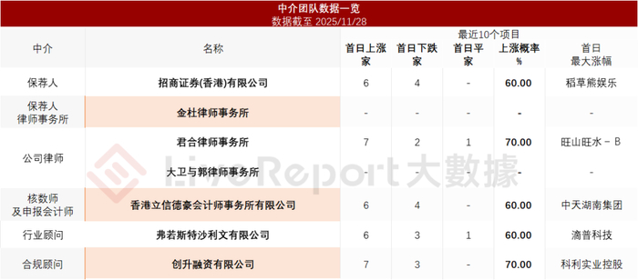 来源:招股书据LiveReport大数据统计,海上鲜介团队共计6家,其中保荐人1家;公司律师共计3家,综合项目数据表现有待提升。整体而言中介团队历史数据表现有待加强。