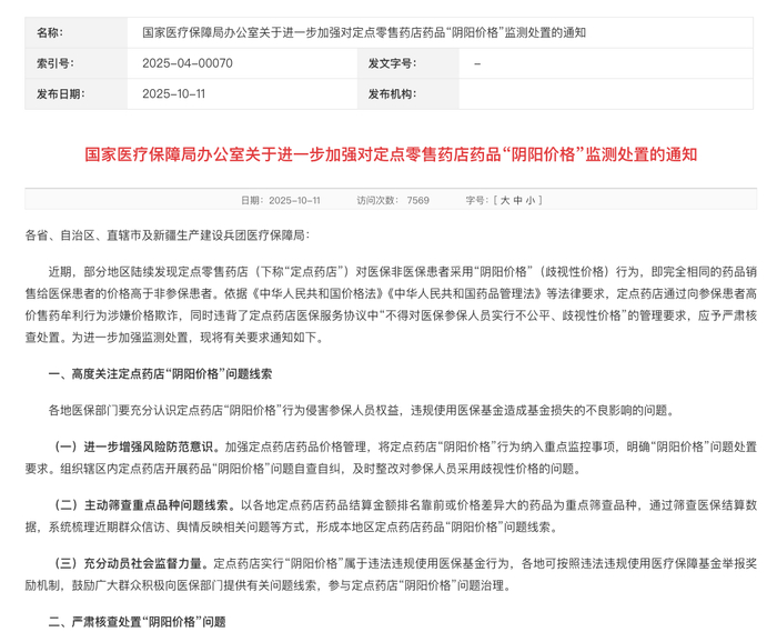 10月11日,国家医保局发布《关于进一步加强对定点零售药店药品“阴阳价格”监测处置的通知》,明确要求各地对“阴阳价格”行为严肃核查处置。