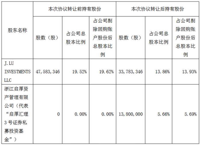 本次协议转让后,J.LU持有公司股份3378万股,占公司总股本的13.86%,占公司剔除回购账户股份后总股本的13.93%。本次协议转让前后转让双方及其一致行动人持股情况如下: