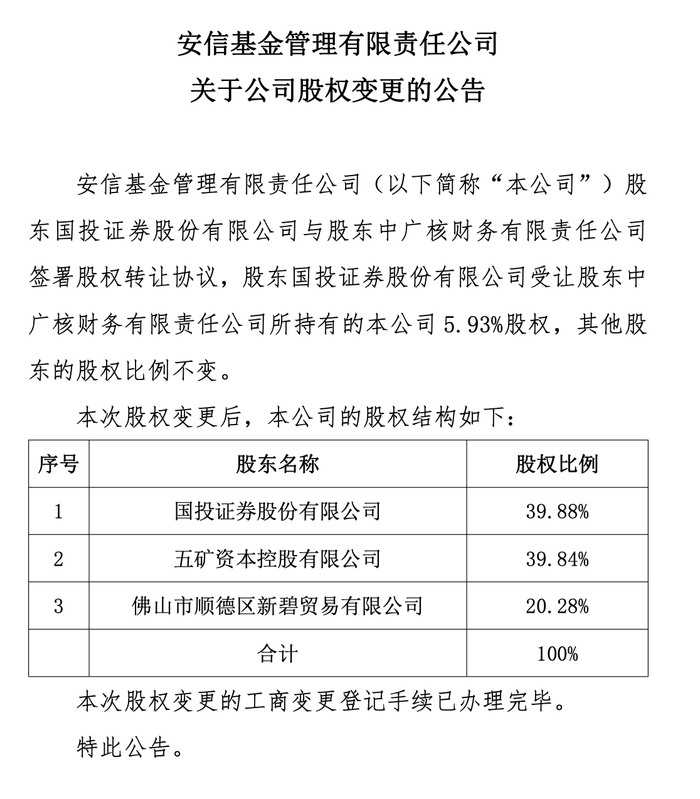 2026年3月19日,安信基金发布公告,公司股东国投证券与中广核财务有限责任公司(下称“中广核财务”)签署股权转让协议,国投证券受让中广核财务所持有的安信基金5.93%股权。