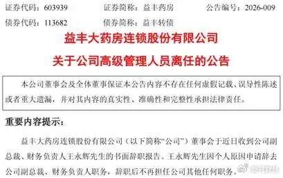 目前,益丰药房已安排公司董事、执行总裁高佑成代行财务负责人职责。尽管公司强调此举不会影响正常经营,但由执行总裁兼任财务负责人,在公司治理中一般只能作为过渡性的“补位”措施。